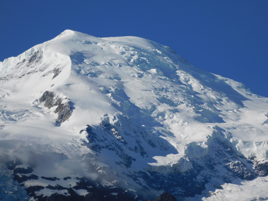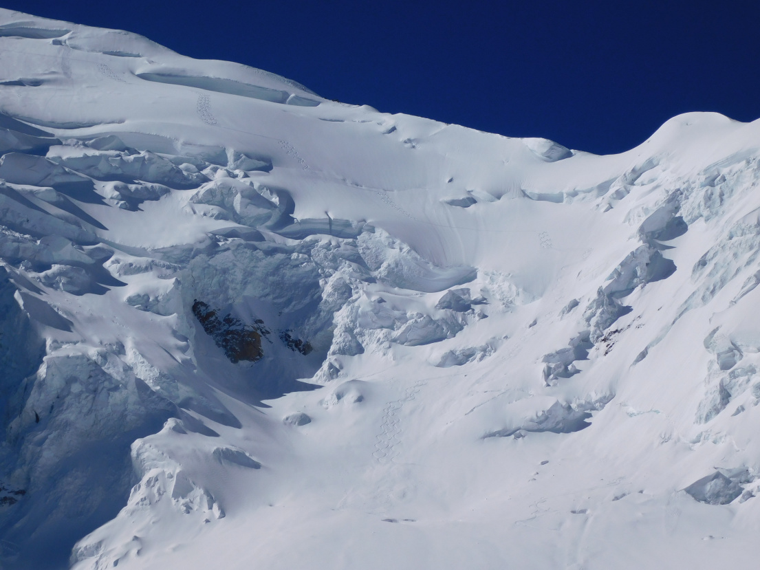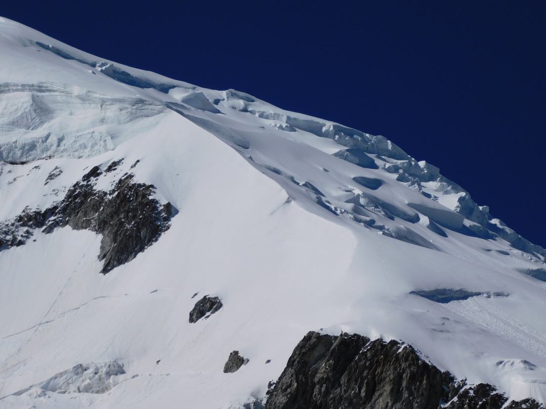 Nahaufnahme Dôme du Goûter - den linken Schneegrat, der halb im Schatten liegt, wollten wir aufsteigen