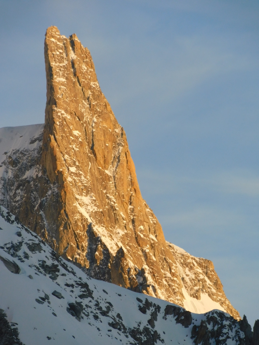 Das Schnee-Couloir der Aiguille Verte leuchtet schon zum Teil in der Sonne.