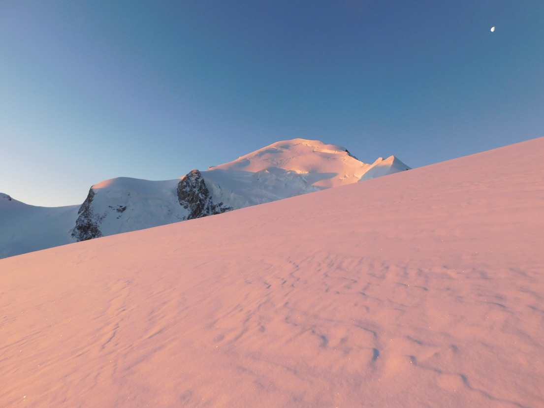 Um 1:30 ging es am nächsten Tag los. Hier waren wir schon kurz unterhalb vom Dôme du Goûter. Hinten sieht man den Montblanc bei Traumwetter!