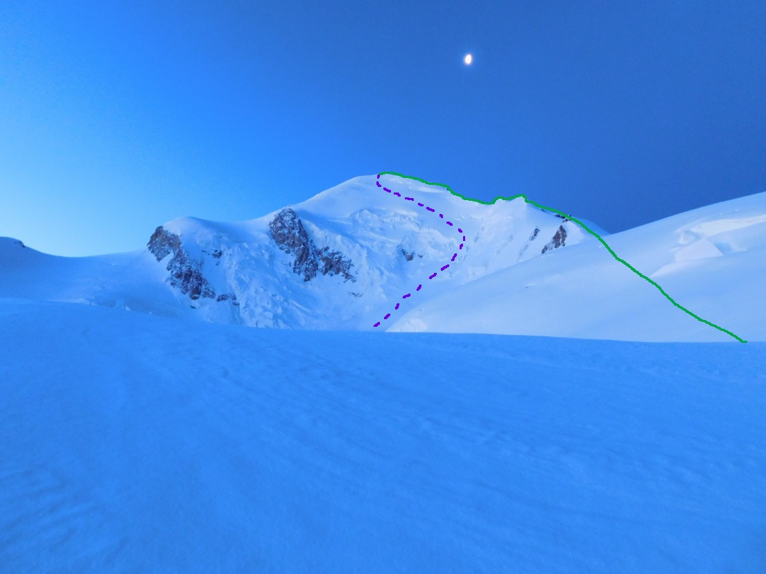 Bald treffen wir auf die Normalroute von der Goûter-Hütte, von rechts geht es dann zum Gipfel hoch