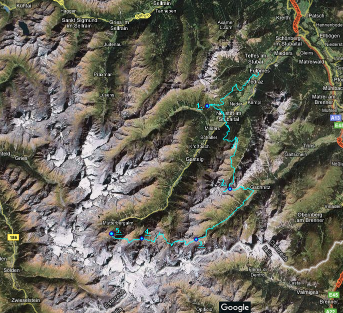 Nachdem ich meine erste Tour u.a. wegen Schlechtwetter im Pfitscher Tal abbrechen musste, habe ich ein paar Tage später eine zweite Alpentour-Runde gestartet, diesmal in den Stubaier Alpen. Die Wetteraussichten waren noch unsicher, der erste Tag war auch noch ziemlich durchwachsen, aber danach hatte ich dann 4 Supertage!! Nur am Dienstag musste ich dann wegen Schnee und Nebel einen Tag auf der Innsbrucker Hütte warten.