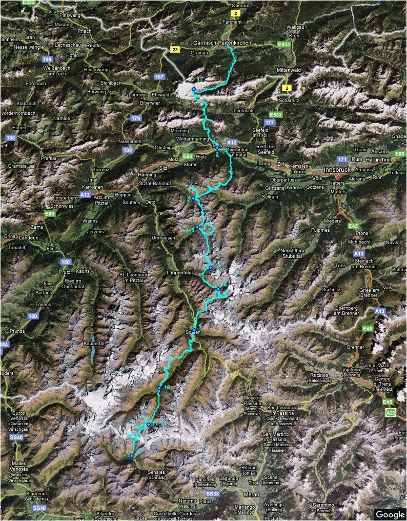 Nachdem mir die Alpentour 2007 sehr gut gefallen hat, wollte ich wieder eine ähnliche Tour machen, diesmal etwas weiter westlich, über die Ötztaler Alpen. Ich habe wieder versucht, einen Weg zu finden, der möglichst wenig in den Tälern, und selten auf Massenstrecken verläuft. Ausserdem wollte ich auch ein paar Gipfel unterwegs mitnehmen. Daraus ergibt sich auch die etwas krumme Wegführung (siehe Streckenübersicht und Profil weiter unten). Die Planung hat mit der Alpenvereins-Kartensoftware gut funktioniert.