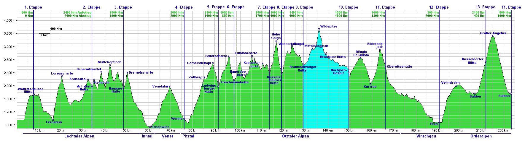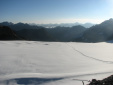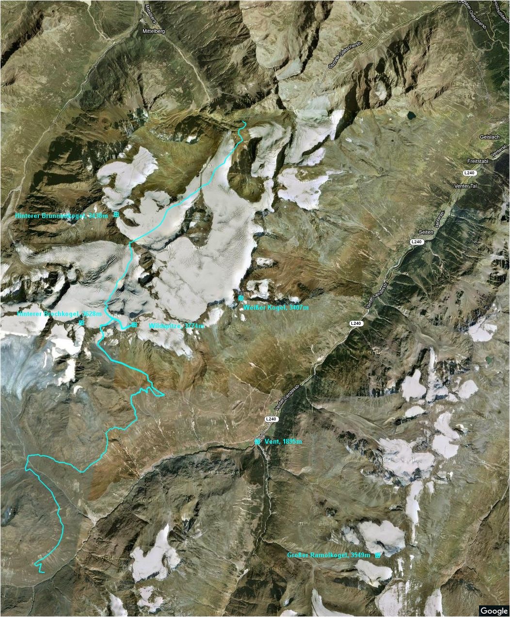 | Die beste Möglichkeit, die ich gefunden habe, um den Weißkamm zu überqueren, war über die Wildspitze. Natürlich ist das eine Gletschertour, die ich nicht alleine machen möchte. Da die Ausgangslage für meine Bergfreunde ungünstig war (flexibler Termin, unterschiedlicher Start- und Endpunkt der Tour), habe ich einen Bergführer dafür organisiert. Der hat sich gefreut, mal wieder eine seltener begangene Route zu gehen. Die meisten Leute suchen sich den kurzen Aufstiegsweg von der Breslauer Hütte aus, von der Braunschweiger Hütte macht das selten jemand. Wir hatten also einen schönen einsamen Aufstieg bis kurz vor dem Gipfel, wo die Leute von der Breslauer Hütte dazukamen. Da wir schon um 1130 unten auf der Breslauer Hütte waren, bin ich noch weiter zum Hochjoch-Hospiz gegangen, eine meiner Lieblingshütten! Ich hab den schönsten Tag auf meiner Tour für die Wildspitze erwischt! Danke auch an den guten Bergführer vom Bergführer-Büro Obergurgl! |