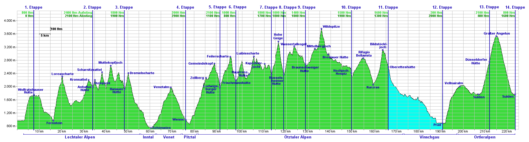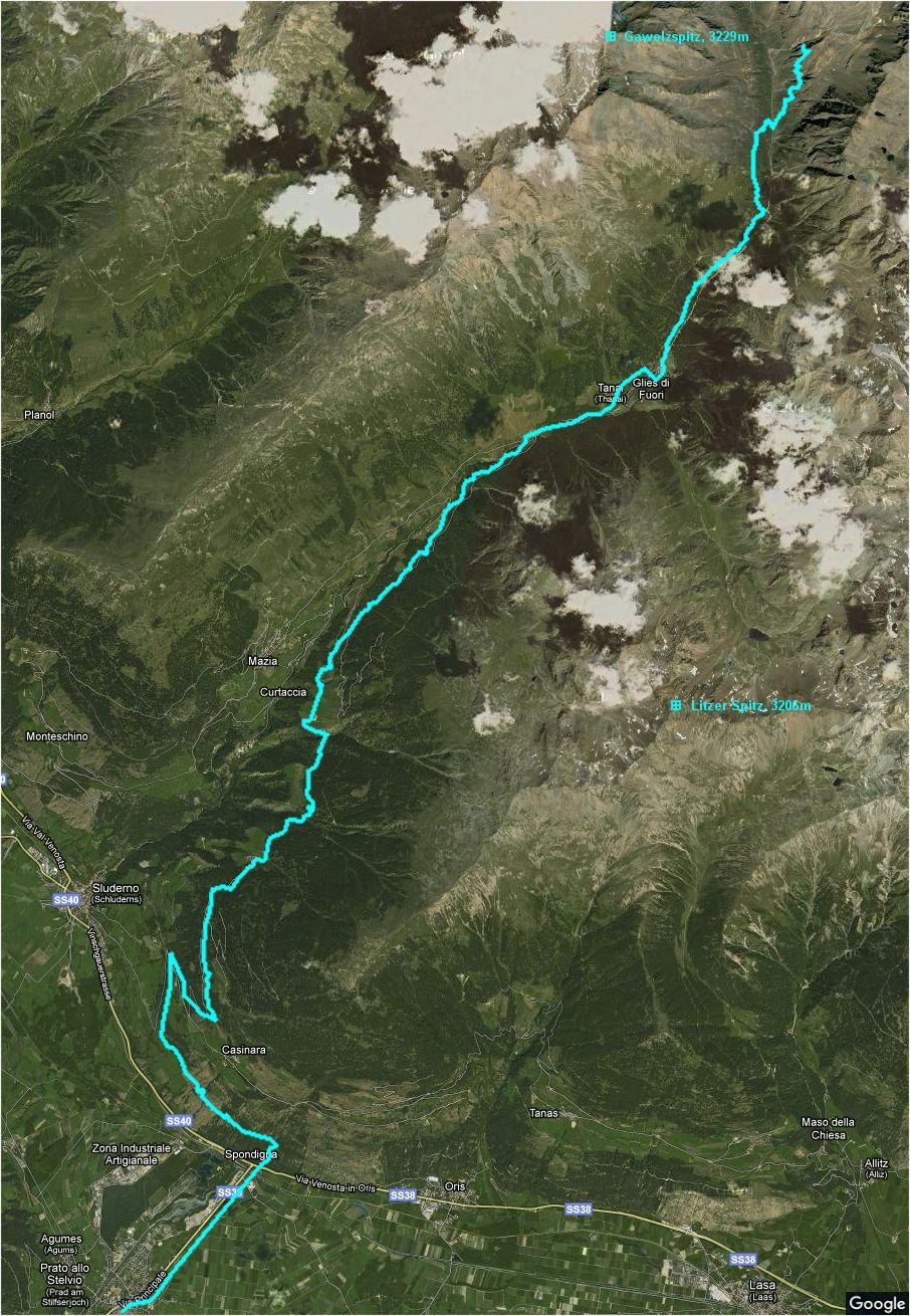 | Der Abstieg ins Vinschgau hat sich schon sehr gezogen, ein ziemliches Gelatsche. Ich hab auch nicht immer den Wanderweg gefunden, so dass ich auch viel auf Teerstrassen gelaufen bin, wodurch mir am Ende die Fußsohlen gebrannt haben. Aber ich bin ja selber Schuld, ich wollte ja unbedingt alles zu Fuß machen! ;-) Ich bin aber auf alle Fälle froh, das so durchgezogen zu haben! In Prad war es dann schwierig, eine Unterkunft zu finden - fast alles ausgebucht! Ich hab trotzdem was nettes gefunden, und gleich für 2 Nächte genommen, um einen Pausetag einzulegen. |