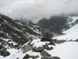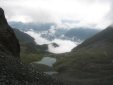 | Das Wetter war an diesem Tag kaum besser, aber wenigstens kein Dauerregen und von der Temperatur her angenehm zum gehen. Um 11 Uhr war ich auf der Hauersee-Hütte, einer gemütlichen Selbstversorgerhütte. Dort war niemand motiviert, bei dem Wetter etwas zu machen. Ich hatte aber keine Lust, schon wieder den ganzen Nachmittag herumzusitzen, und bin einfach weitergezogen. Das war schon etwas spannend, weil ich mir nicht sicher war, ob ich die Zeitangaben (8h bis zur nächsten Hütte) bei den Verhältnissen (Schnee, Nebel) unterbieten kann. Aber zum Glück hat es trotzdem gut geklappt. Wiederum hab ich auf dem Weg den ganzen Tag niemanden gesehen, was auch ganz schön sein kann. |