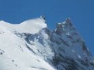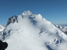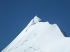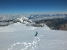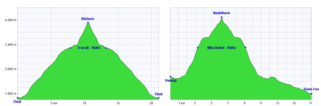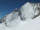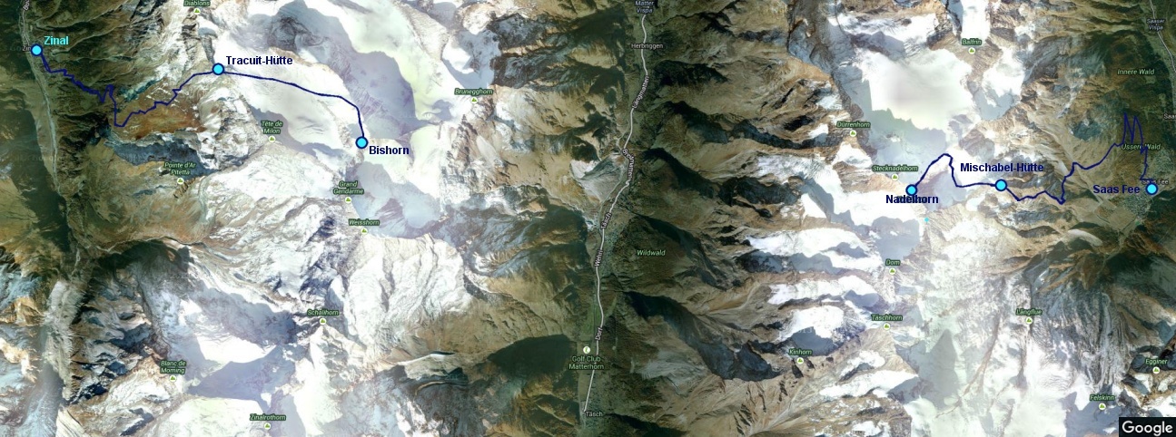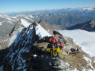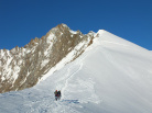 | Das Bishorn ist eine tolle Option für den ersten 4000er. Technisch ist die Tour nicht schwierig, aber relativ lang, und man muss sich den Gipfel vom Tal aus erarbeiten. Da es keine Abkürzungs-Optionen gibt, ist dort weniger los als häufig auf anderen beliebten "einfachen" 4000ern wie Breithorn, Allalinhorn oder Weißmies. Eigentlich hatten wir den Montag als Gipfeltag angepeilt, aber dort sind wir dann bei Schneesturm auf der Hütte festgesessen. Am nächsten Tag mussten wir deshalb alles auf einmal machen (Gipfel, Talabstieg, Überfahrt ins Saaser Tal) - dafür hatten wir aber das seltene Privileg, die Bishorn-Tour bis fast ganz oben durchspuren zu dürfen, bei schönstem Wetter! Die Aussicht war auch eine der schönsten, die ich in den Alpen bisher gesehen hatte. Für Conny war es auch ein toller erster 4000er, gut einem Jahr nach ihrem Hochtourenkurs! Am nächsten Tag sind wir dann zur Mischabelhütte aufgestiegen, was auch ein ziemlich knackiger Hüttenaufstieg ist. Es ist empfehlenswert, sich vom Hüttengipfel aus noch ein Bild vom ersten Teil der Aufstiegsroute für den nächsten Tag zu machen. Bei uns waren die Verhältnisse gut! Die Nadelhorn-Tour hat diese Schweiz-Woche dann noch schön abgerundet - vom Nadelhorn konnten wir den Bishorn-Gipfel sehen und umgekehrt! Insgesamt waren es heuer drei super Tourenerlebnisse in der Schweiz! |