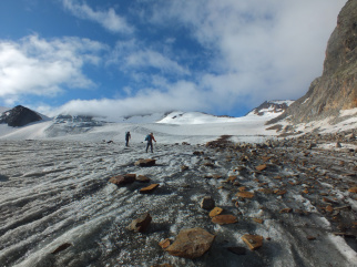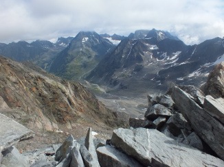| Auf dem Weg ins Wallis haben wir einen Abstecher ins Ötztal gemacht, um eine Tour zu probieren, die schon länger auf dem Wunschzettel stand: Den Ostgrat der Wilden Leck! Die Tour ist ziemlich lang, da auf dem Zustieg zum Ostgrat schon 1000 Höhenmeter zu bewältigen sind. Aber die Tour hat sich auf jeden Fall gelohnt! Es war auch ein gutes Kraxel-Training für die Wallis-Hochtouren, denn dort waren die reinen Kletterschwierigkeiten dann spürbar leichter. Die meisten Stellen im Aufstieg waren gut mit Bandschlingen oder Friends zu sichern. Der Abstieg durch die Südwand ist durch einen Felsabsturz unterbrochen, dort wurden provisorische Abseilstellen eingerichtet. Eine schöne Tour, die wahrscheinlich durch den langen Zustieg oft einsam ist! Außer uns (2 Seilschaften) haben wir den ganzen Tag niemand gesehen. Auf bergsteigen.com findet man ein gutes Topo der Route. |