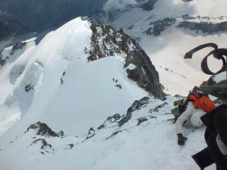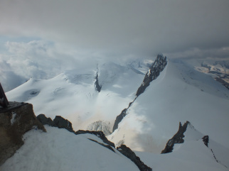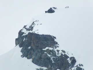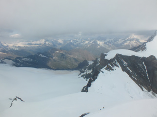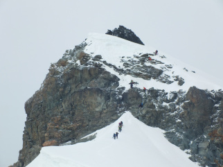 | Beim Allalinhorn sind leider beide Standard-Routen oft voll (Normalweg und Hohlaubgrat), beim Hohlaubgrat ist es aber nicht ganz so krass. Bei der Schlüsselstelle kurz unterhalb des Gipfel staut es sich oft, ansonsten kann man gut ausweichen. Man sollte nur versuchen, vor den Leuten, die von der Metro Alpin (Station Hohlaub) dazukommen, auf dem Hohlaubgrat zu sein. Wir haben später gesehen, dass der Stau bei der Schlüsselstelle größer geworden ist. Leider hat sich dann für die nächsten Tage schlechteres Wetter angekündigt, so dass wir dann die letzte Tour gestrichen haben und heimgefahren sind. Trotzdem waren wir auf jeden Fall sehr zufrieden mit der Tourenwoche! |