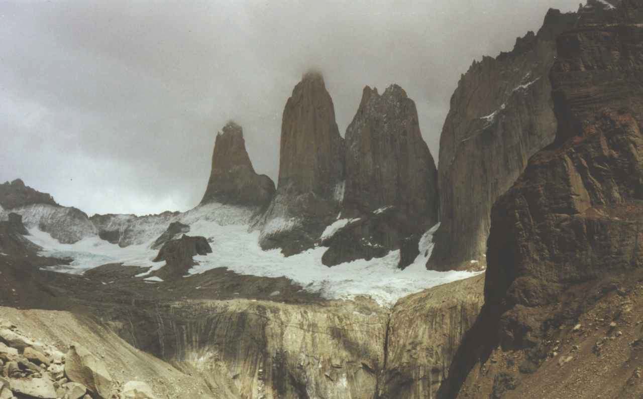 Am nächsten Tag hat es dann erstmal geschifft wie Sau, und es war so kalt, dass wir unsere Nudeln im Stehen essen mussten. Aber zum Glück waren wir regentechnisch ganz gut ausgerüstet und sind trotzdem auf zu den Torres. Man geht an einem Fluss hoch bis zur Hütte "El Chileno", danach latscht man nochmal solang durch den Wald bis zum nächsten Zeltplatz. Danach ist es nur noch eine 3/4-Stunde über ein Felsenfeld, bis man die geile Aussicht auf die Torres geniessen kann. Wir hatten Glück, und die Wolken sind, genau als wir oben waren, für 10 Minuten aufgebrochen.