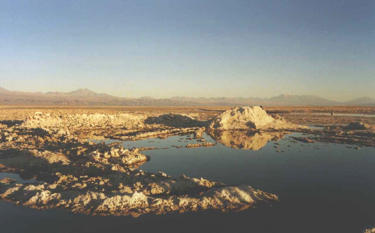 Laguna Chaxa ist ein kleiner, stark salzhaltiger (riecht man von weitem) See mitten im Salzsee (Salar de Atacama). Durch den starken Salzgehalt spiegelt das Wasser ziemlich krass, ist schön anzuschauen (kann man auf dem Foto auch ein bisschen sehen). Bei dieser Tour kommt man auch im Wüstenort Toconao (ziemlich langweilig) und einem bewachsenen Wüstental, das sich in den Aufstieg zur Hochebene gegraben hat, vorbei.
