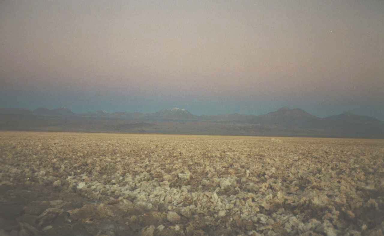 Hier noch ein Beispiel, was für komische Farben ein Sonnenuntergang in der Wüste produzieren kann. Vorne werden die Wolken von untergehenden Sonne rot gefärbt, hinten über der Hochebene ist der Himmel noch blau und wolkenlos. Vorne sieht man auch, dass dieser Salzsee ziemlich verkrustet ist, nicht so glatt und sauber, wie beim Salar de Uyuni, zu dem ich später noch komme.