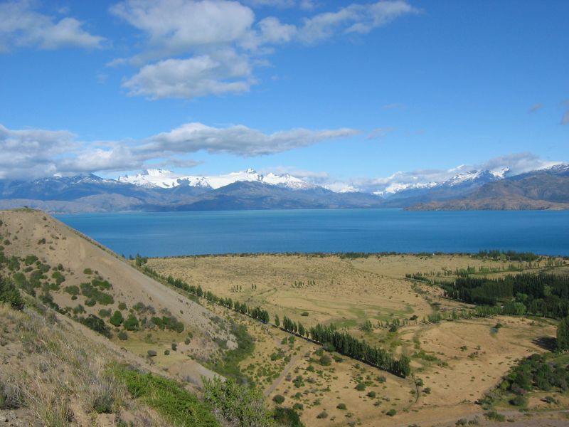 Der See ist fast 300 km lang, 20 km breit, und hat ca. in der Mitte (etwas westlich von Chile Chico) eine extreme Wetterscheide, wo man auch deutlich einen Vegetationswechsel erkennen kann. Auf der westlichen Seite herrscht fruchtbares Pazifikklima mit viel Regen, und auf der östlichen Seite das trockene Klima der patagonischen Inlandebene. Auf diesem Foto hat man einen Blick nach Westen auf die Berge des nördlichen Eisfeldes am Westufer des Sees.