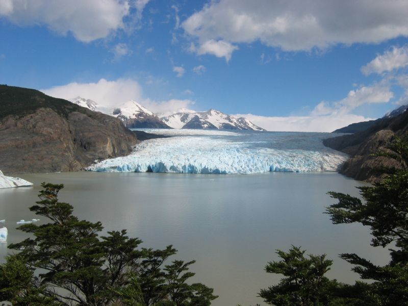 Diesen Aussichtspunkt kann man auch erreichen, wenn man den "W"-Weg wählt. Das "W" und der Kreis treffen sich beim Refugio Grey, und beim Parkeingang Laguna Amarga. Der Grey-Gletscher sieht auf dem Foto schon sehr gross aus, ist aber auch nur eine kleine Zunge vom südlichen Eisfeld, welches sich fast 1000 km über Südpatagonien erstreckt. Dieses Eisfeld erzeugt das gesamte Wettergeschehen für Südpatagonien. Der Grey-Gletscher ist in diesem Gebiet die grösste Zunge, deshalb fliesst dort auch der meiste Wind ab, der von dem Eisfeld erzeugt wird. Deshalb ändert sich das Wetter im Torres-Park auch so schnell, es ist sehr wechselhaft. Die starken Winde werden aber vom Paine-Massiv stark abgebremst, weshalb es auf der Nord- und Südostseite eher windstill ist.
