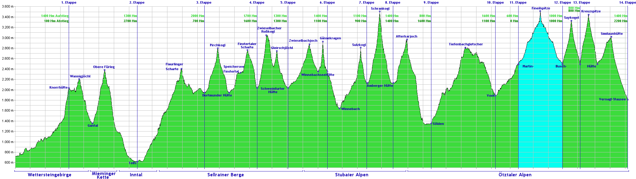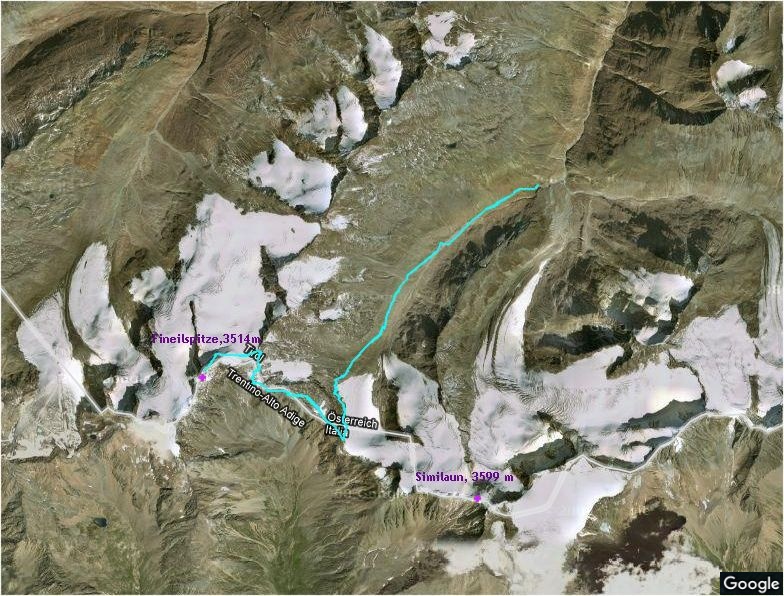 Eigentlich war für diesen Tag gutes Wetter angekündigt, was aber nicht ganz auf den Hauptkamm zugetroffen ist. Ab Vormittags waren die Gipfel fast durchgehend in Wolken, nur darunter hatte man gute Sicht. Trotzdem war die Fineilspitze eine schöne Tour, mit leichter Kraxelei im Gipfelbereich, und einer kurzen Gletscherquerung beim Hauslabjoch. Zum Glück hatte mir der Uli Steigeisen mitgebracht, die konnte ich für diese Querung schon gut brauchen.