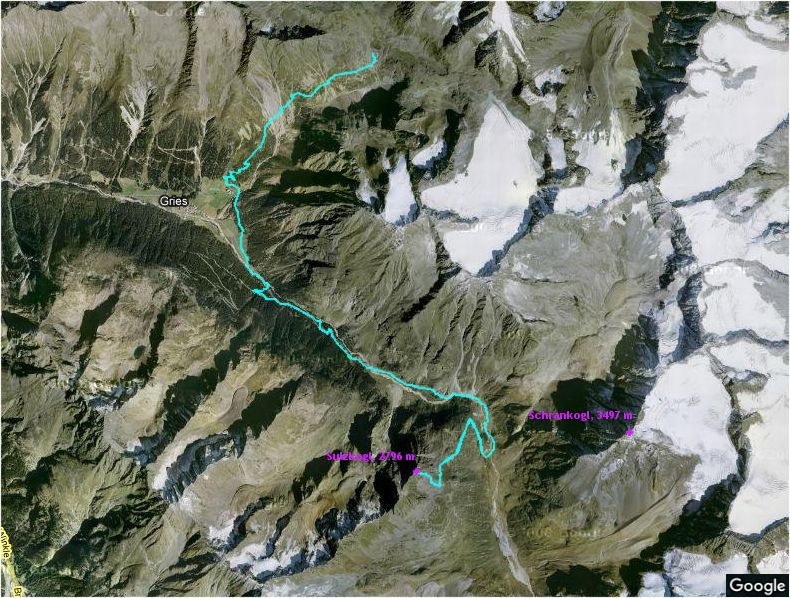 Am nächsten Tag war das Wetter schlecht. Für die Wanderung zur Amberger Hütte war es aber kein Problem, man läuft meistens sogar auf einer Forststraße. Auf der Hütte hat es dann langsam aufgelockert, ich bin dann noch auf den Sulzkogl gestiegen, um eventuell ein schönes Foto vom Schrankogl zu machen. Das hat leider nicht geklappt, die Wolken haben sich nicht verzogen, sondern sind später wieder dichter geworden.